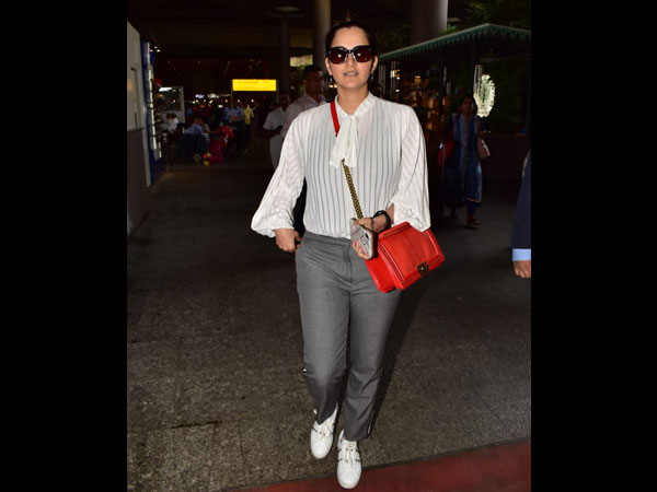 So, Sania wore a sheer shirt that featured a bow-like collar and was accentuated by stripes and flared sleeves. It was a sheer shirt, which she teamed with grey-coloured pants. Now, that was an absolutely elegant teaming of outfits. Sania's airport ensemble actually made for great formal wear and she paired her top and pants with white-hued sports shoes.