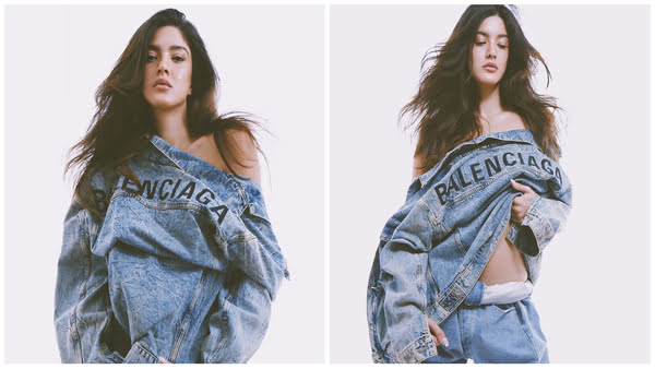 The gorgeous Shanaya Kapoor elevated the classic denim on the denim look with glamour. The diva wore an oversized Balenciaga acid-tone denim jacket with a reverse side facing front. The brand monogram in black worked as a design element for the casual denim jacket. She teamed the funky jacket with a pair of baggy jeans to form the double-denim look. Shanaya opted for a risqué style with no-tee or top look and simply flaunted the jacket with the back-side facing front as top wear!