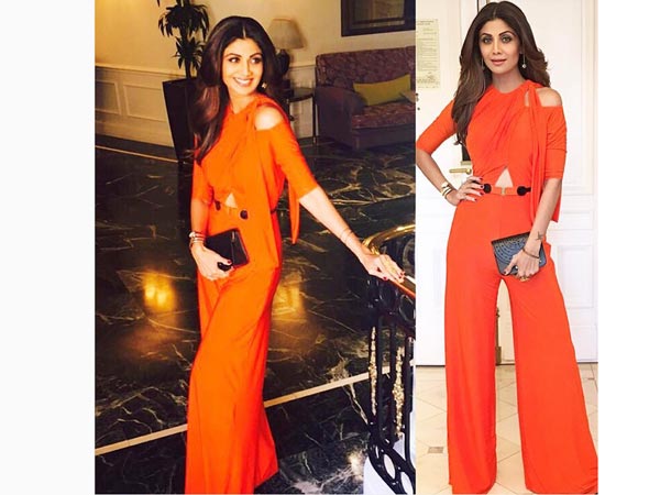 Shilpa wore an orange jumpsuit from designer duo Shivan & Narresh. The jumpsuit was a slinky fit with a very stylish combination of drape, knot and cutouts. She paired it with an orange and black pellet belt. The bottoms were of a flared style.