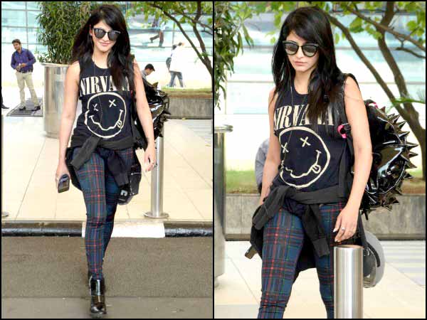 Shruti wore a sleeveless tee, flashing the word NIRVANA. She paired the look with skin tights and black ankle boots. She appeared to be what we commonly refer as emo.