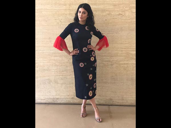 Shruti Haasan was recently spotted wearing a classic number in black while promoting her upcoming movie, Behen Hogi Teri. The star was seen wearing a black midi by Shahin Mannan. The graphic design on one side of the dress added glamour and beauty to the outfit.