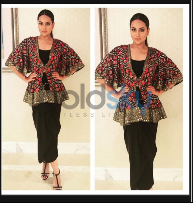 Sonakshi Sinha wore a tribal jacket and black tulip dress which was showcased in Arpita Mehta's all new Winter/Festive collection at LFW 2015 ramp last week.