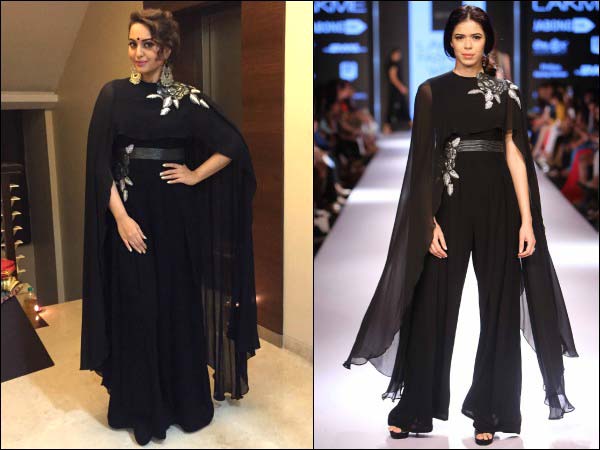Sonakshi Sinha was spotted at Amitabh Bchchan's Diwali party. She was seen donning a Ridhi Mehra jumpsuit. The black flared jumpsuit looked sexy and seductive on her. The jumpsuit was accompanied with a long cape which gave her a perfect party look. This runway outfit looked definitely good on her.