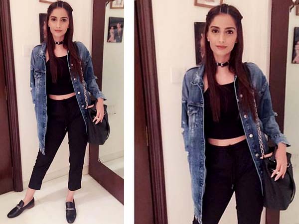 Sonam wore a black crop top with high neck and black hight-waist pants. She paired this entire look with an oversized denim jacket. She further added black loafers to the look. And to amp up this entire look, she added a black sling bag.