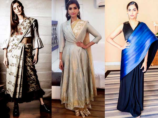 Off late Sonam has been one of those few actresses who is always spotted wearing something Indian every few days. Sonam has lately been wearing a lot of sarees and she has been giving all the saree looks a twist of her own.