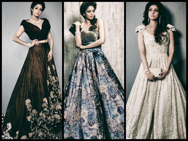 The actress is seen wearing fresh from the runway (The Empress Story) Manish Malhotra looks. For example, Sridevi looked fab in this Manish Malhotra's Fall/Winter 2015 embroidered floor-sweeping lehenga gown which has been worn with a raised shoulders blouse. She wrapped the look with diamond jewellery from Jindal Jewellers.