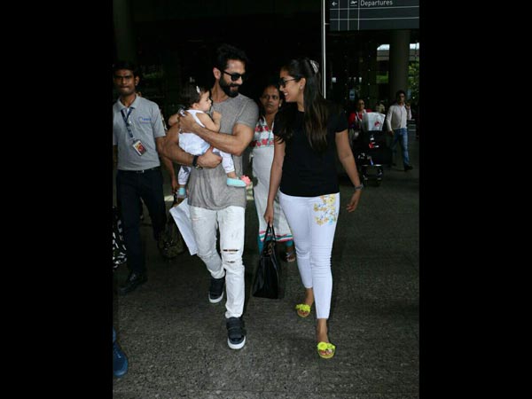 The baby Misha, while embraced in daddy Shahid's arms also flaunted her cute stylish avatar. She, also in casuals was made to deck up in those bellies she wore. Mira reflected her choice of pop colour slippers also in her daughter's style statement.