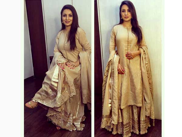 Tisca was dressed in a sharara set from the designer duo Aakriti & Sukriti. The sharara set was of a deeper beige shade. The kurta was plain with buttons half-way down the front, and the sharara bottoms below had a gold zari applique.