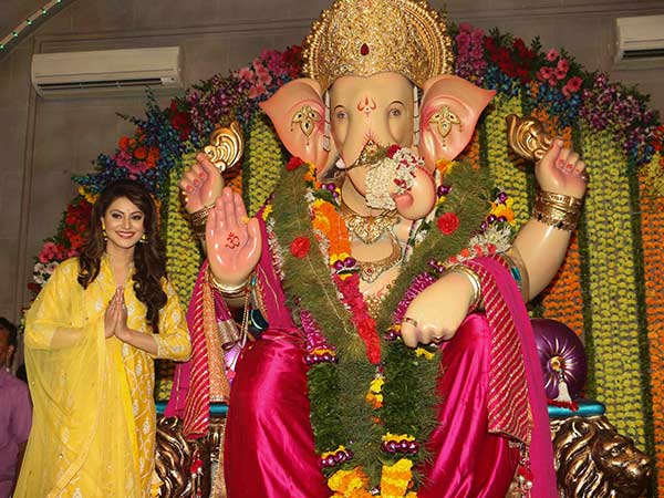 Actresses Urvashi Rautella and Poonam Pandey were spotted at the festival 'mandap' and they worshipped the idol in their traditional attires.