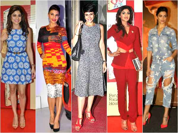Shilpa Shetty wore a chic velvet red blazer at her book launch, while Shamita Shetty wore a modest blue floral dress. On the other hand, we saw Deepika in shades of denims. Jacqueline wore rainbow bodycon dress and Mandira picked a classy grey cocktail dress for designer Masaba's pre-wedding bash.