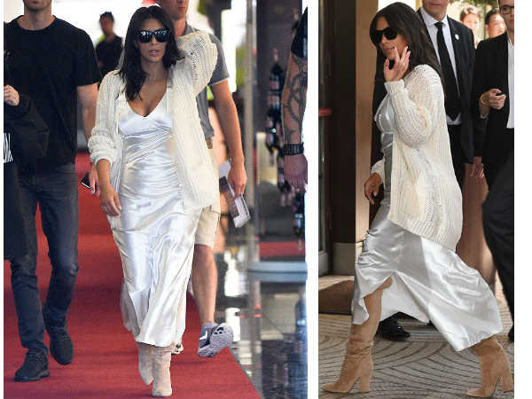She stole the show by arriving at Cannes in a white slip dress with a plunging neckline. Definitely dressed to kill, Kim walked with utter attitude. She paired her slinky white dress with a loose knitted white cardigan. To finish the look Kim added a pair of suede boots.