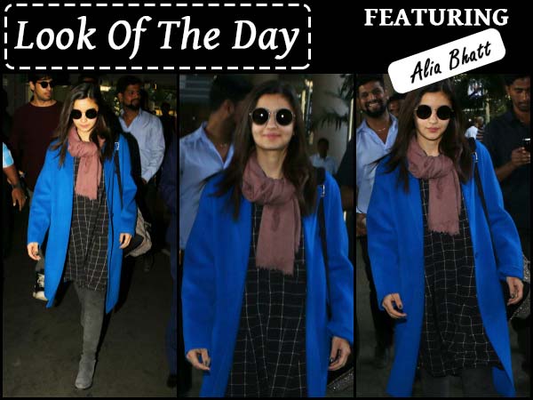 Recently, Alia added a bit of her style and a bit of Kangana's to her airport lookbook. She picked a black and white checker kurta paired with a bright blue long coat. The whole look was put together with the help of a neck scarf and knee-length boots.