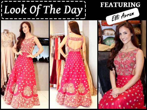 In today's Look Of The Day section, we bring you Elli Avram in a vibrant Kalki outfit. We spotted Elli when she was visiting the Kalki fashion store for a style story shoot for TV Asia.