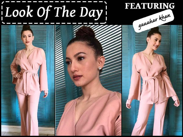 Gauahar Khan works out a blush pink pantsuit and we are loving it. Take a quick look.