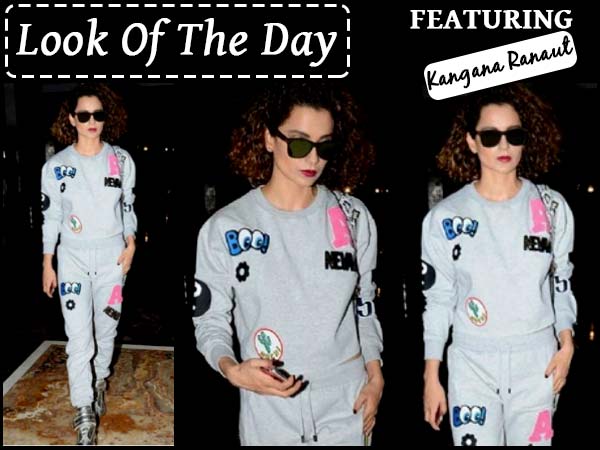 A peppy grey sweatshirt with a matching track pant. The outfit came with quirky patches. She paired this look with metallic silver sneakers from the label Maison Margiela. Kangana finished the look with black sunglasses and red lips.