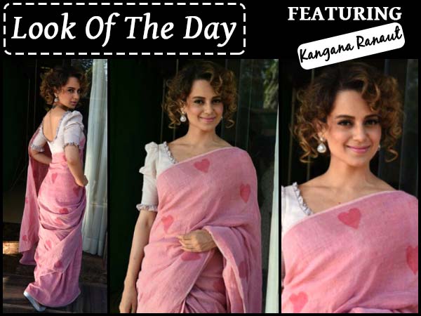 Kangana picked a beautiful blush pink saree. Now the cutest part of this saree is its heart prints. The saree was featured with beautiful hearts. Let's take a moment to analyse how cute this saree is!
