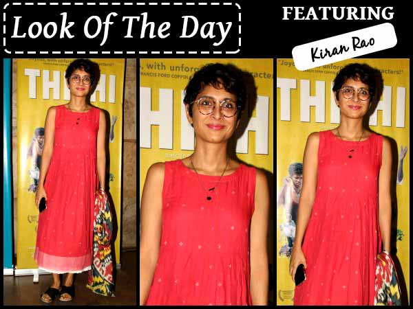 Recently, at the screening of Waiting, we spotted Kiran in a beautiful tunic dress. The sleeveless pink dress ended right above Kiran's knees. She added Birkenstock slippers and her nerdy glasses.