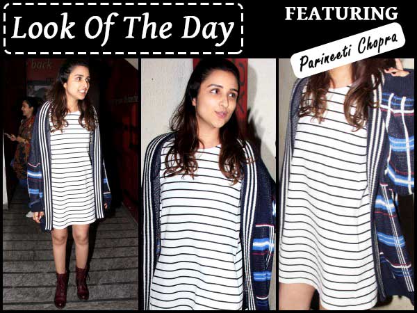 Parineeti's movie outfit was quite different from what she is used to wearing. She wore Breton striped shirt dress with an oversized blue jacket paired with tan boots. Efforts, well put together.