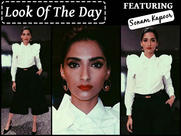Clad in white and black separates, Sonam did not leave out her edgy and offbeat factor here, too. Sonam picked this lookbook from the label Comme des Garcons. A white accentuated shoulders shirt tucked neatly in black palazzo pants.