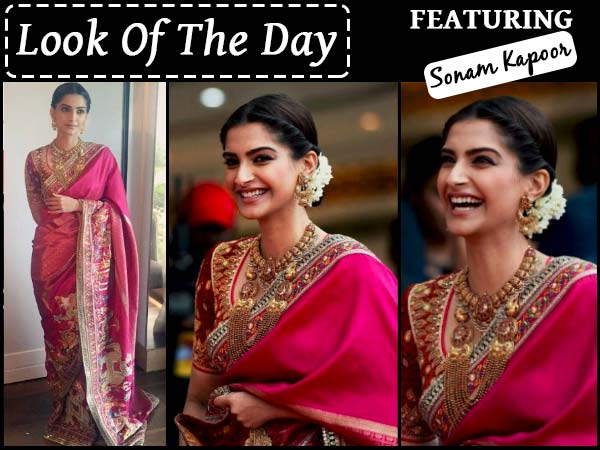 As they say jaisa desh vaisa besh... Sonam was drenched in South colours. For this event, Sonam picked a silk saree from the label Abu Jani Sandeep Khosla. The saree is was a way to beautiful with lauding wedding procession prints. We loved how the pink of the saree was highlighting the brilliant details of the saree.
