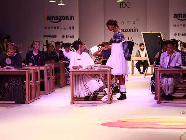 In this collection of Pero, Aneeth brings the school girl-themed garments. For the first time ever, the runway is decorated with desks and the models are pretending to be the students. Quite a walk, must say.
