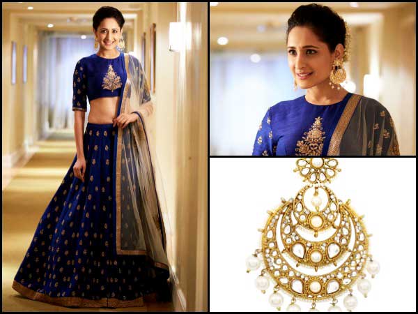 Pragya wore an enchanting royal blue lehenga embellished with intricate golden thread work. Pragya further aced look by wearing heavy gold and beads earrings by Shilpa Purii.