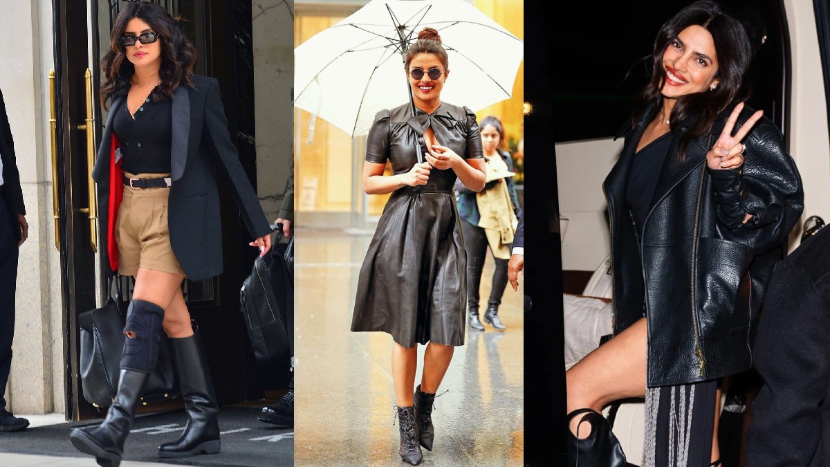 Not one to repeat, Priyanka spun another rainy-day winner with slouchy tie-up boots, a leather jacket, and a fitted bodycon dress. The juxtaposition of structure and slouch made the look a street-style dream.