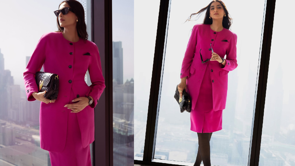 Sonam paired the suit with sheer black tights and sleek black heels, adding a grounding contrast to the vibrant pink. A black purse complemented the look without stealing attention. Her jewellery was minimal, a few gold rings and a classic watch keeping the focus on the outfit and the announcement. She completed the look with open, natural hair and subtle makeup, letting her radiant smile and the moment itself take centre stage. Even her black sunglasses added a touch of modern chic without feeling overdone.