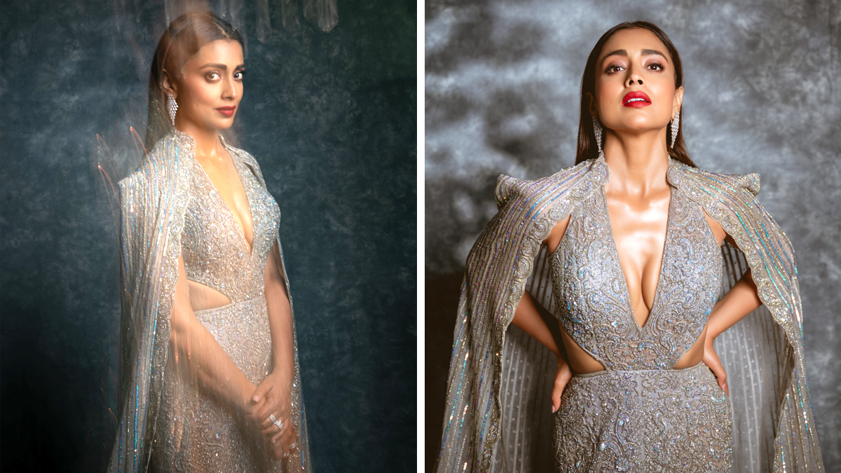Shriya Saran shared some inspirational clicks on Instagram wearing a shimmery ensemble. She chose a fit and flared silhouette designer gown by DL Maya. Her dress detail included a halter neck, cutouts at the waist, and an attached cape. The dress featured intricate details featuring sequins all over!