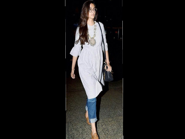She is wearing a Bhane summer dress with high-waisted denims. The dress is matched with a heavy tribal neckpiece and she certainly slays the travel look with a pair of nerd glasses and a black sling bag.
