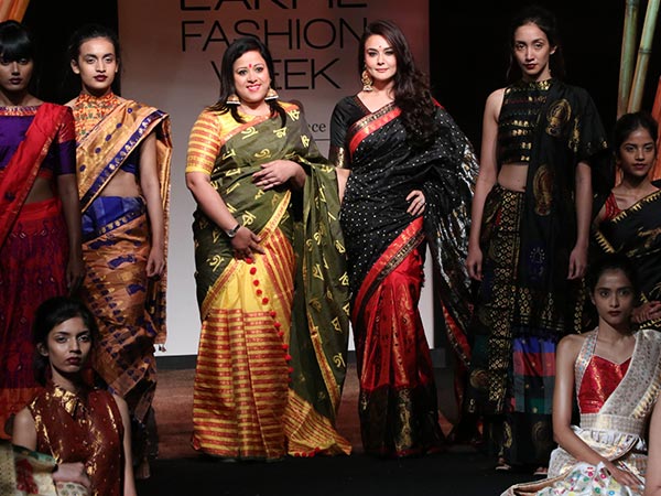 Sanjukta Dutta's Mekhela Chador is ethinicity at its best. The showstopper Preity Zinta walked in a beautiful black silk saree. The sarees are beguiling. The edgy prints and dark hues are highlighting feature of this collection.