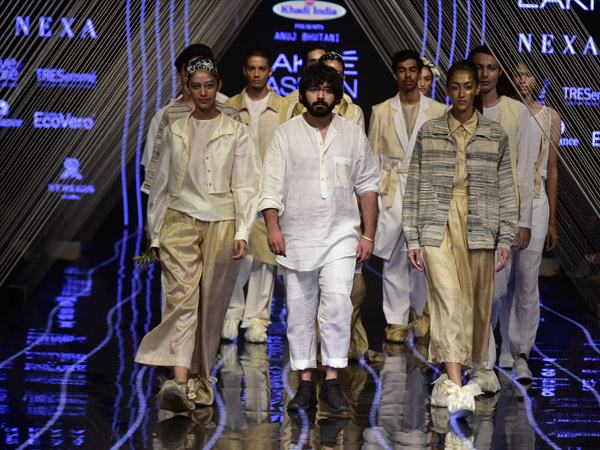 One of the models walked down the ramp in a structured dress at LFW W/F 2019, which was made out of quintessential khadi fabric. Muted and dipped in the shades of grey, this quarter-sleeved dress featured tassle bodice, which was a stunning addition. She paired her dress with shoes and socks and carried a small bunch of flowers with her.
