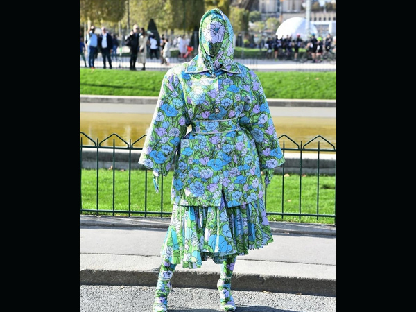 Cardi B's ensemble was by Richard Quinn and it was avant garde of course, because you see her head was covered and she looked straight out of a superhero comic book. The attire was adorned with green, white, and blue floral accents. It consisted of a cinched-waist jacket with exaggerated sleeves and she paired it with a matching pleated skirt. She also wore stockings that matched with her ensemble. Her attire was old-fashioned but that head cover made us uncomfortable.