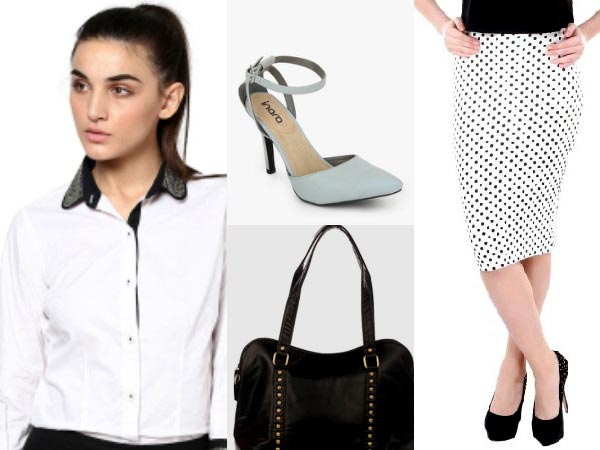 Polka Dot Pencil Skirt: Assuming you've bought the shirt. Now. You need to pair it up with the best skirt you can lay your hands on, and guess what it is right here? -- available in perfectly matching print: Black and white polka dots; a pencil skirt. This will go perfectly with your white shirt. The skirt has a slit at the end making your leg movement easy.
