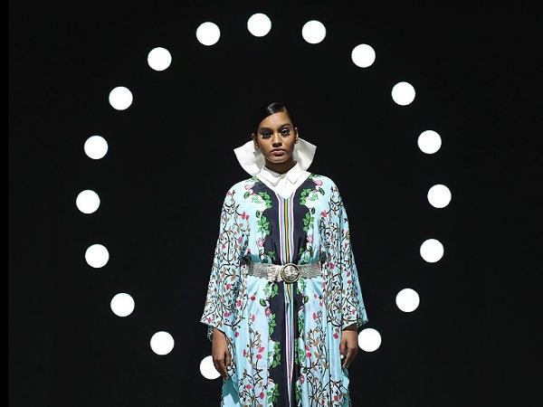 The main highlights of their Chrysalis collection were pantsuits and asymmetrical short dresses but this organza-crafted collection went beyond the basics, while the brand maintained their unique fashion language. Not only did the label broaden the range of outfits with Aurora but dramatic colour-blocks and a more significant interplay between embellishments and fabrics was seen. For instance, the structured jacket dress comprising a lotus-inspired jacket paired with a crisp white-collared shirt and gold metallic detailing, was a winner because it could have made one look a class apart. This outfit was a summation of inspirations, right from vintage nature-inspired and classic white collar to contemporary embellishments, and it worked.