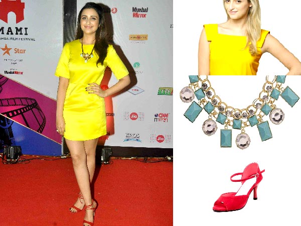 Fashion is all about trends and who establish these trends? In India, it's the B-town stars. Recently, we spotted Parineeti Chopra at MAMI Mumbai Film Festival in a satin 3/4 sleeve yellow dress. She neatly paired them with red heels.