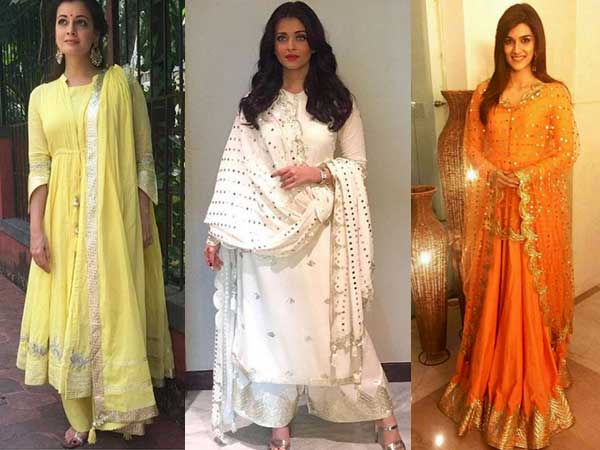2. Lemon Yellow Suit: Not up for bling? No problem. Try a solid cotton suit and accessorise it like Dia Mirza here. This will be a subtle Diwali look. So wear heavy makeup if you're going for something like this. You can even get stitched for you. All you have to do is buy your favourite cotton cloth and silver gotta.