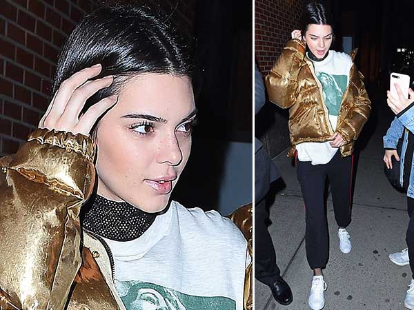 The model turned heads in a breezy attire. It looked like Kendall came out in our home clothes and still managed to swoon everyone around her. A high neck oversized white tee paired with black track pants. She finished the look with a super cool puffer golden jacket.