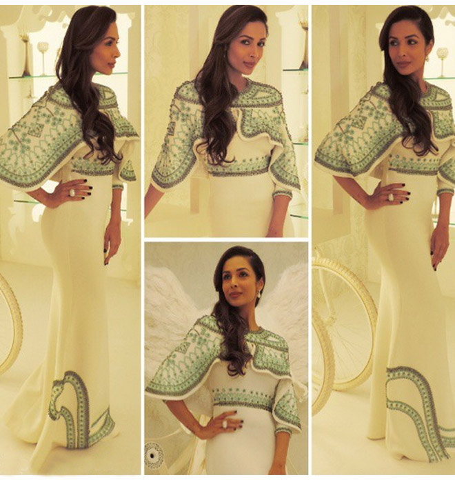 Malaika wore the white column gown with drop Anmol earrings, Mahesh Notandas ring and studded Louboutin pumps.