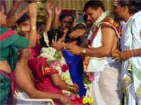 The Mangala suthra Dharana is of prime importance in Hindu marriages. The groom ties the thread containing the marks of the Vishnu or Shiva in the neck of the bride to assure the holy blessings for his wife as long as he lives. The groom then places sindhoor (red powder) on the bride's forehead symbolizing her as a married woman. The groom's parents bless the couple and offer cloth or flower to the bride symbolizing her joining of the groom's family. The marriage comes to an end while all those assembled shower flowers on the couple and blesses them to show their consent or happiness.