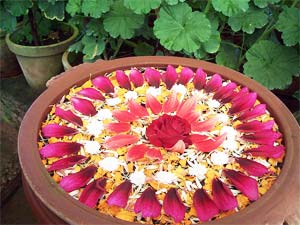 1. Flower Rangoli – Flower petals specially the bright yellow sevantis (chrysanths) and rose can become the filling of the rangoli. Even the outline can be with leaves and soft twigs. All that one needs is a nice paper cutting of a design (that can be taken print out from the internet), fill the petals in the design without leaving an empty space. To add more to the rangoli alternative, you can sprinkle the scent water and beads to make the area fragrant, fresh and colorful.