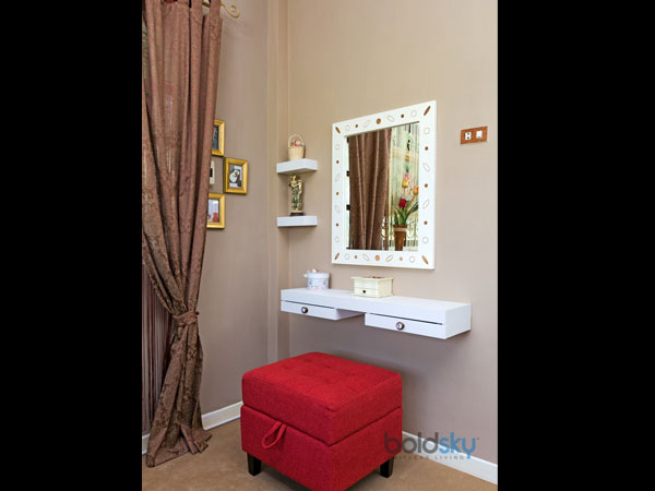 Some master bedrooms have empty blocks in the walls that are used to stuff furniture. You can curtain it off and hang a tiny mirror and shelf on the wall. Get a small stool and set up your mini dressing room within your bedroom.