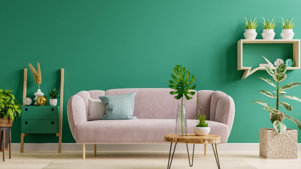 A posh and comfy velvet sofa paired with speckled wallpaper will liven up any living room.