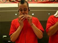 He is also world's hot-dog eating champ. He folded the slices very quickly, and thrust them into his mouth. He jumped around some, to help them go down the hatch, or knocked back water from paper cups. He never appeared to chew. The slices were the typical cheese and tomato sauce variety, dished from a 16-inch pie carved into eight wedges.