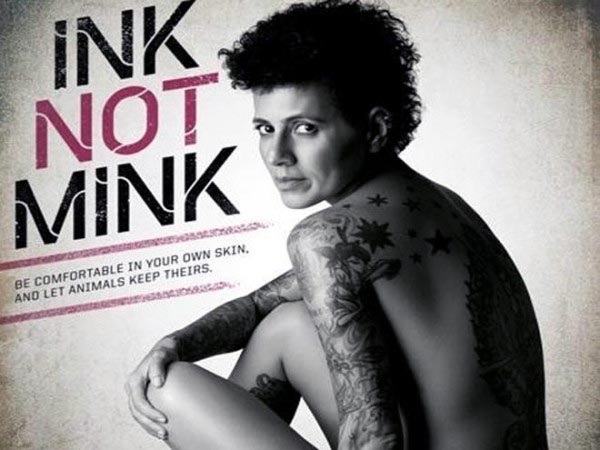 The ad says, 'Ink Not Mink' alluding to the fact that Sapna has a lot of tattoos on her body but she refuses to wear mink (fur) coats. This campaign shows Sapna with her back to camera displaying her bold tattoos.