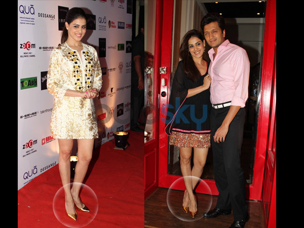 The stunning Genelia d'Souza who attended two events in the recent past wore on the same pair of gold mirror patent pumps. Now we all know that these celebrities have a mindset about wearing on particular shoes, accessories and even the same clothing to some of the events they attend But, when they make it so obvious of wearing the same accessories in the same month without any interval of time, it mases their fans wonder if they lack the ability to get themselves a new pair of shoes or other accessories.