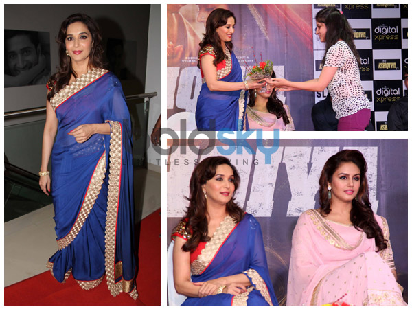 At the Dedh Ishqiya Music Launch, Madhuri Dixit was seen in a striking blue saree which encapsulated our mind. What caught our attention the most is the way the Bollywood actress carried off the look. At the Dedh Ishqiya Music Launch, all eyes were on the actress who wore on this bright blue Jade saree by Monica and Karishma. Taking a close look at the stunningly beautiful actress, we can see that age doesn't hold her back from looking good. With the right type of attitude and the perfect choice of colour to match her skin tone, Madhuri Dixit was the star of the night.