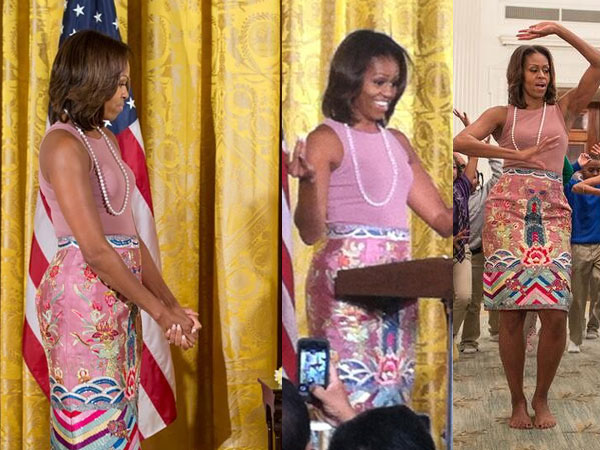 The Naeem Khan creation fit the First Lady's well and flaunted her toned figure to perfection. Michelle Obama completed her Diwali look with a simple pearl necklace. Later she was seen wearing the flower garland after the Puja was performed by the Brahmin. Michelle Obama was in the perfect festive mood as the First Lady danced to some desi Indian beats and showed her desi moves.