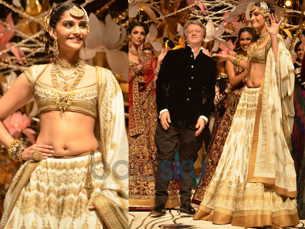 Showstopper Sonam Kapoor wore a creamy white lehenga with golden patches on it. The lehenga had a big frill on it and was embroidered with golden zari. Sonam accessorised it with gold jewellery.
