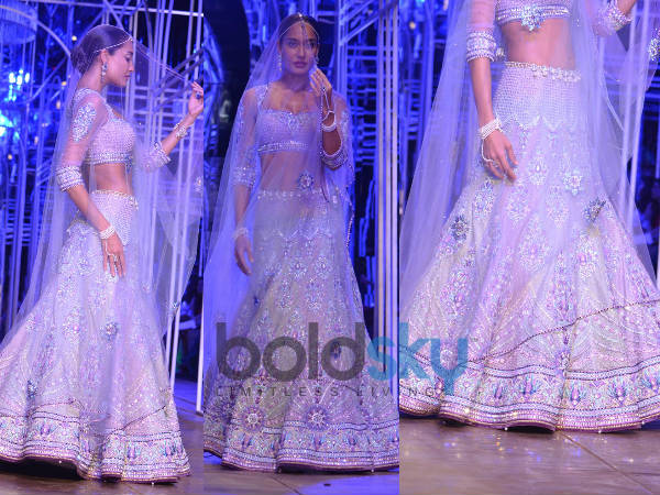 The hot and seductive actress was a total surprise on the Day 6 of IBFW 2013. She looked breathtaking in this silver lehenga. It was shining bright like a diamond with swarovski and pearl embellishments on it.